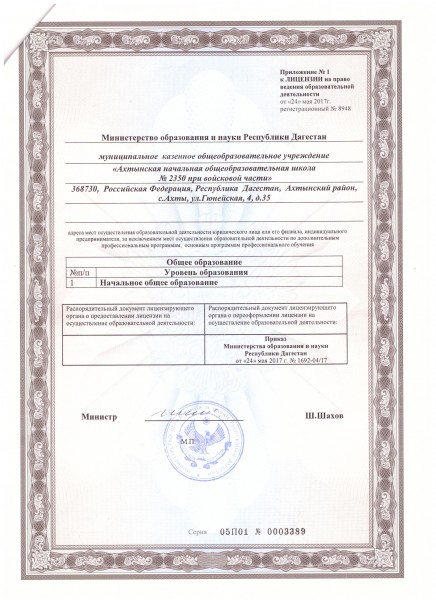 | Полное наименование образовательной организации* | Муниципальное казенное общеобразовательное учреждение «Ахтынская начальная общеобразовательная школа № 2350 при войсковой части» |